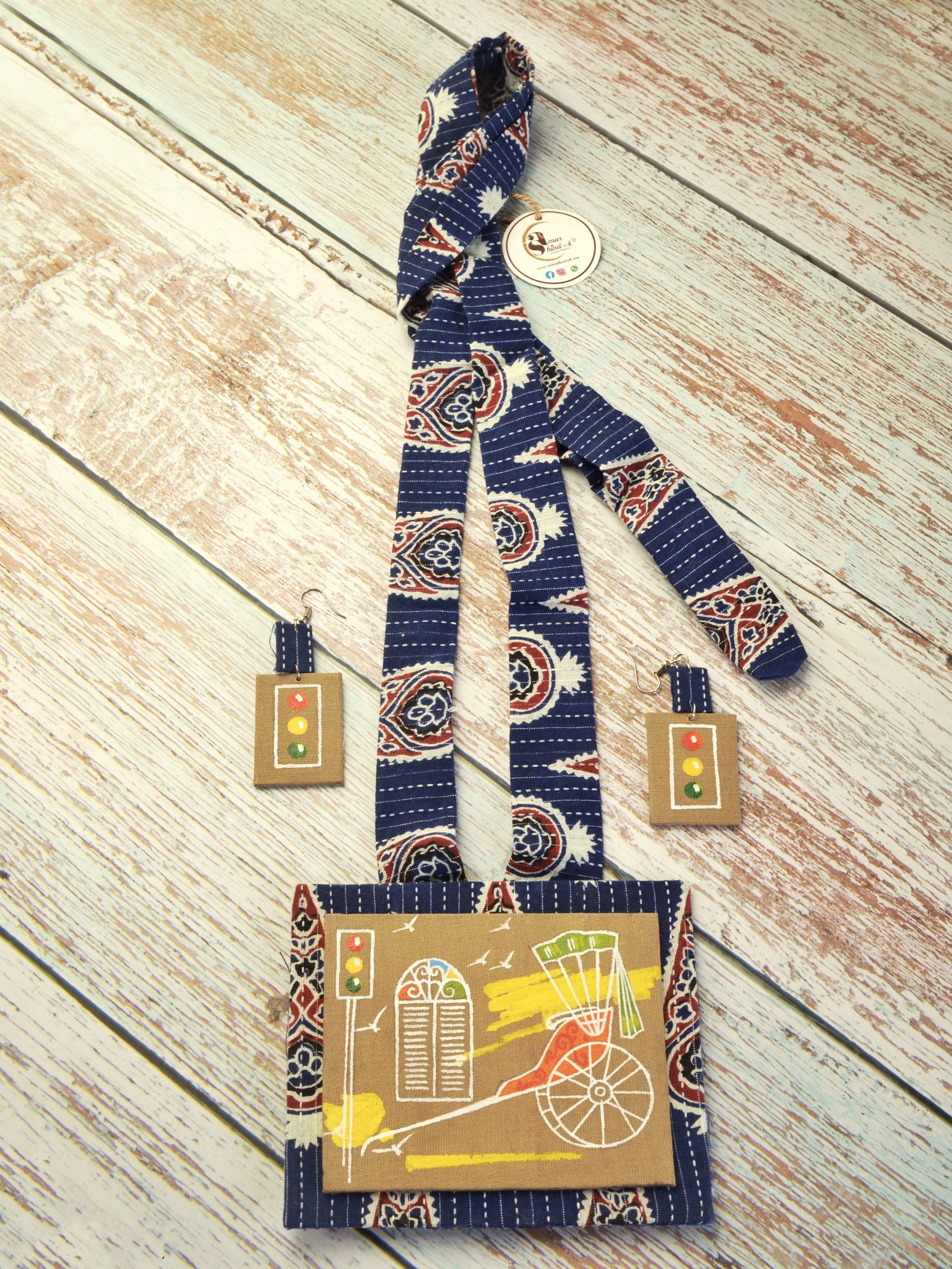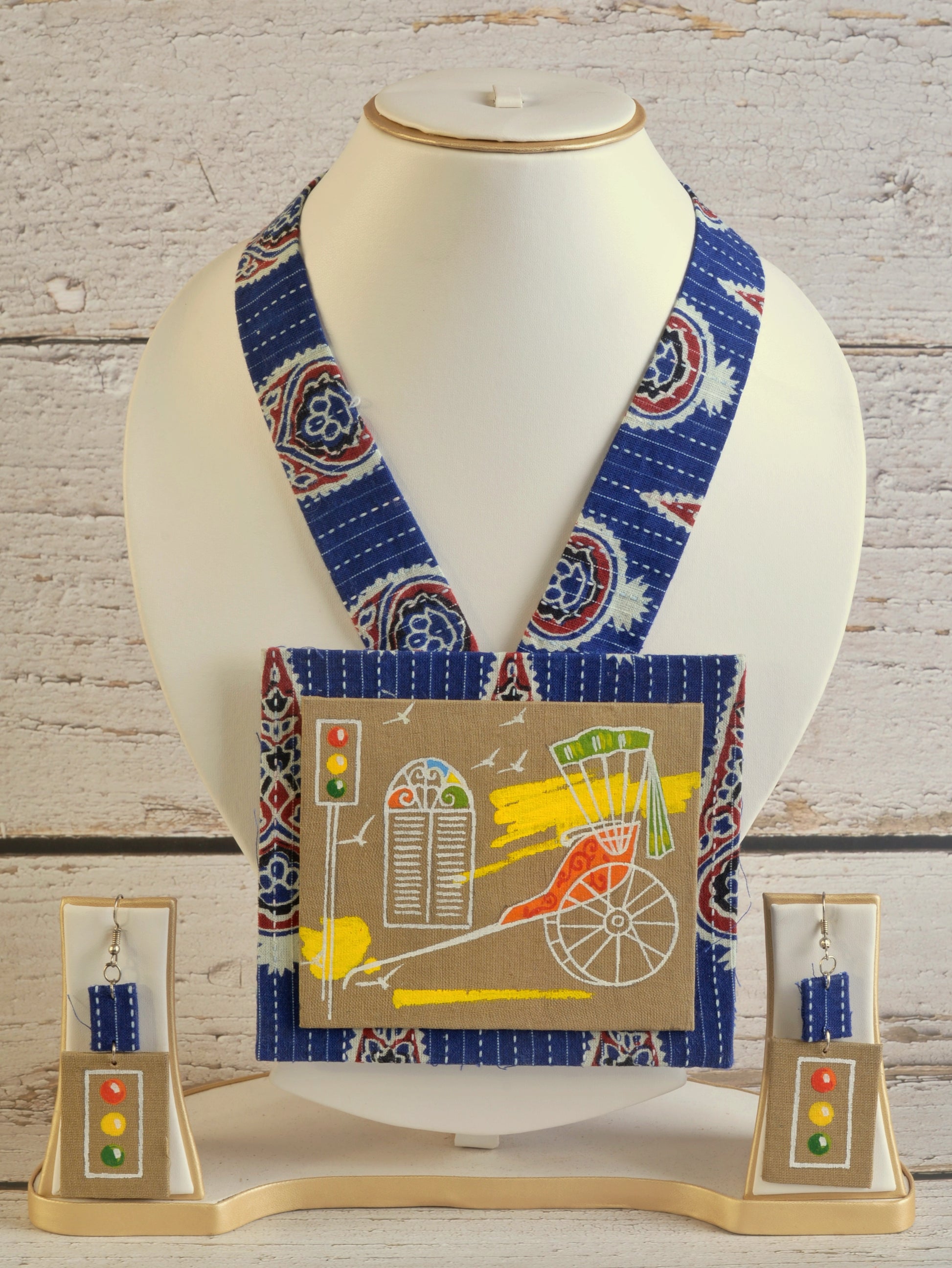 Kolkata theme-based fabric jewellery captures the essence of the City of Joy, blending tradition with contemporary design and quirkiness. Drawing inspiration from Kolkata's iconic landmarks, festivals, and cultural motifs, these jewellery pieces often feature symbols like Howrah Bridge, trams, and Durga Puja elements. Crafted in elements like fabric, our Kolkata theme-based jewellery includes necklaces, earrings that celebrate the city’s vibrant spirit and colour. These pieces are popular among those who want to carry a piece of Kolkata with them, offering a perfect blend of nostalgia and modern style. Perfect for city lovers and fashion enthusiasts alike.