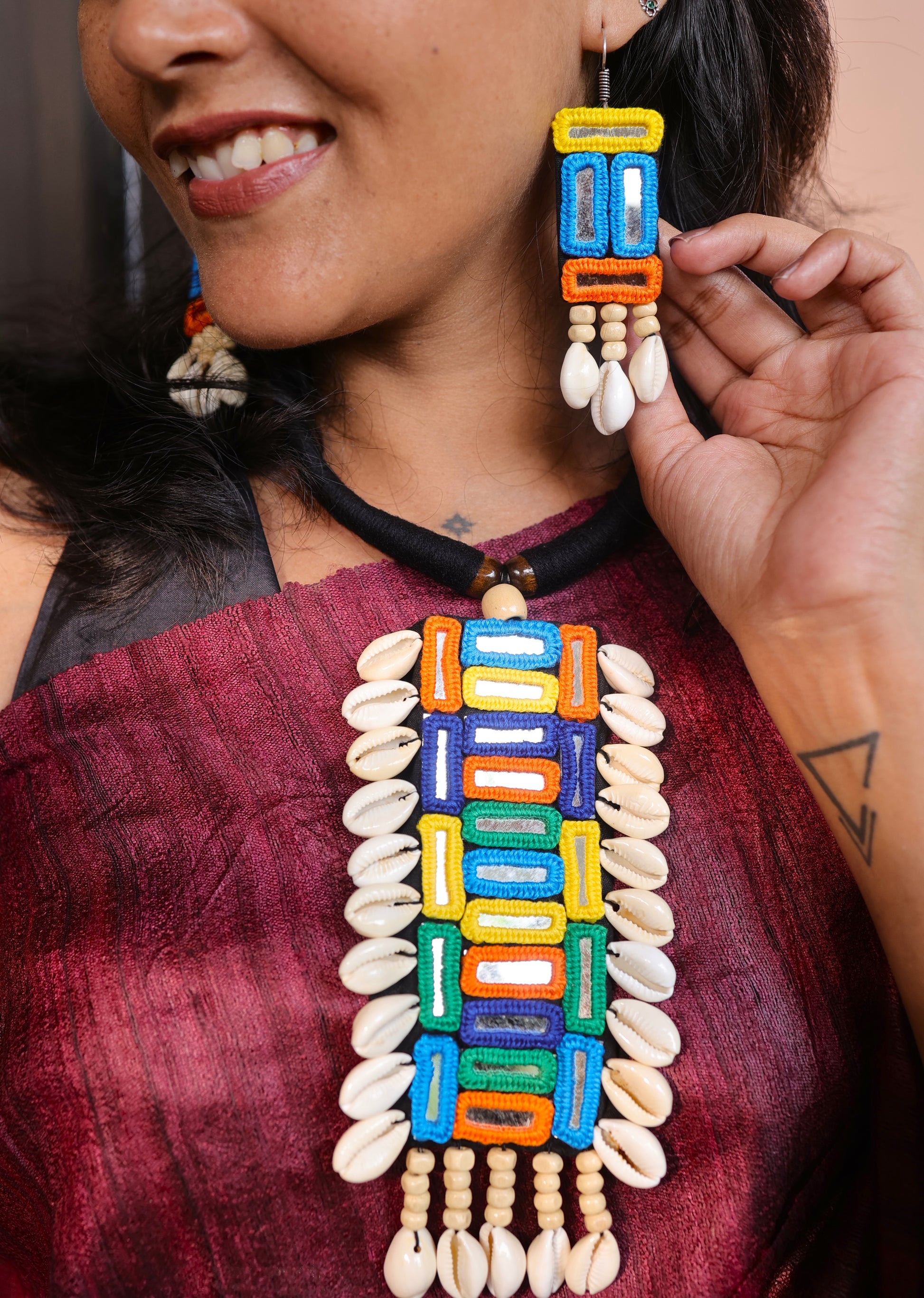 Mirror work jewellery is an exquisite form of handcrafted artistry that reflects both beauty and tradition. These exclusive ornaments often feature small, intricately cut mirrors embedded in a variety of jewellery pieces, from necklaces to earrings. Traditionally worn in Indian weddings and festivals, mirror jewellery has gained popularity globally for its bold, reflective designs that catch the light and create a dazzling effect. These handcrafted pieces are often paired with colourful beads and metalwork, creating a vibrant, festive look. Our Mirror jewellery ornaments are a perfect choice for those seeking to make a bold fashion statement with a touch of cultural heritage.