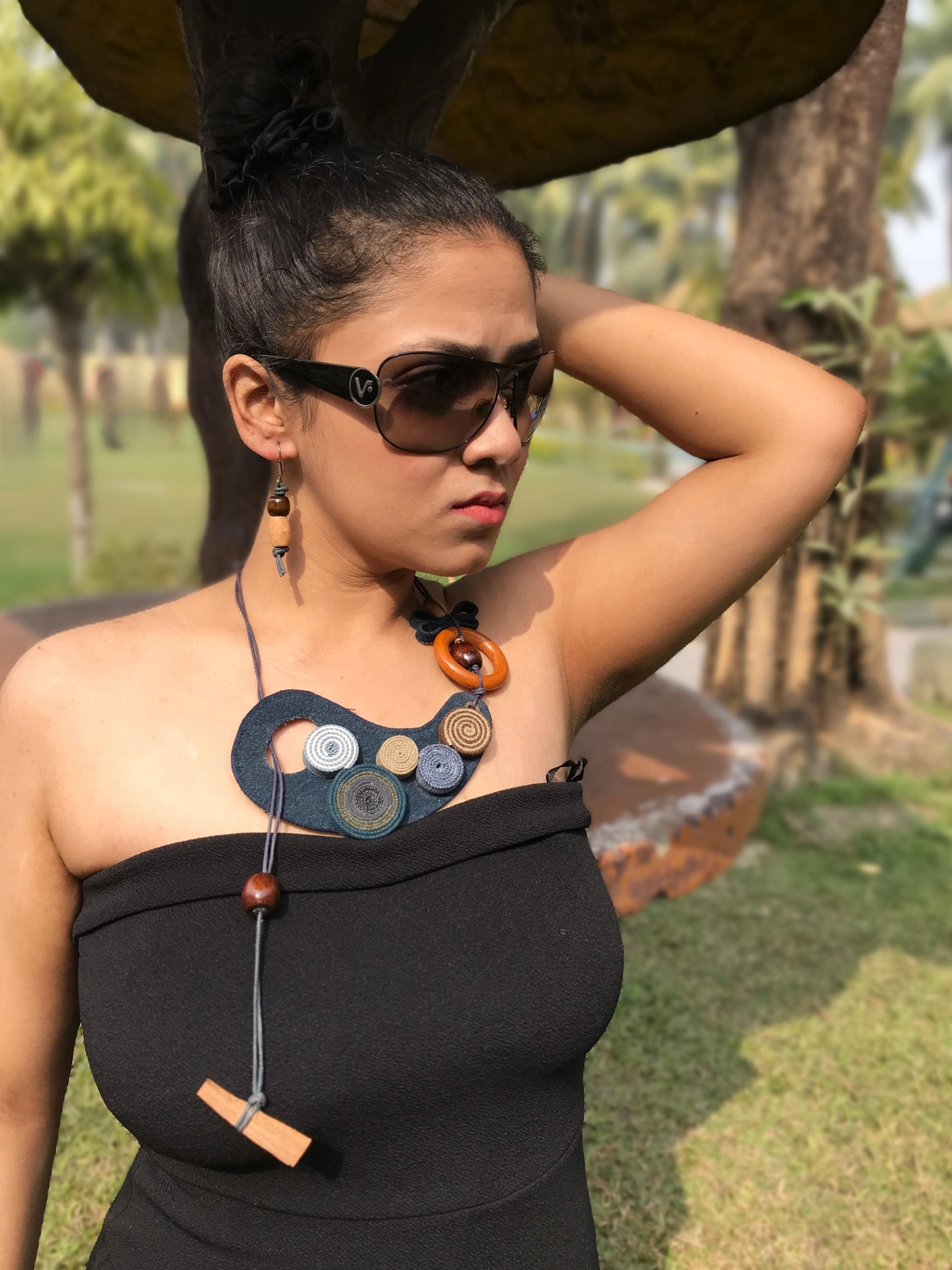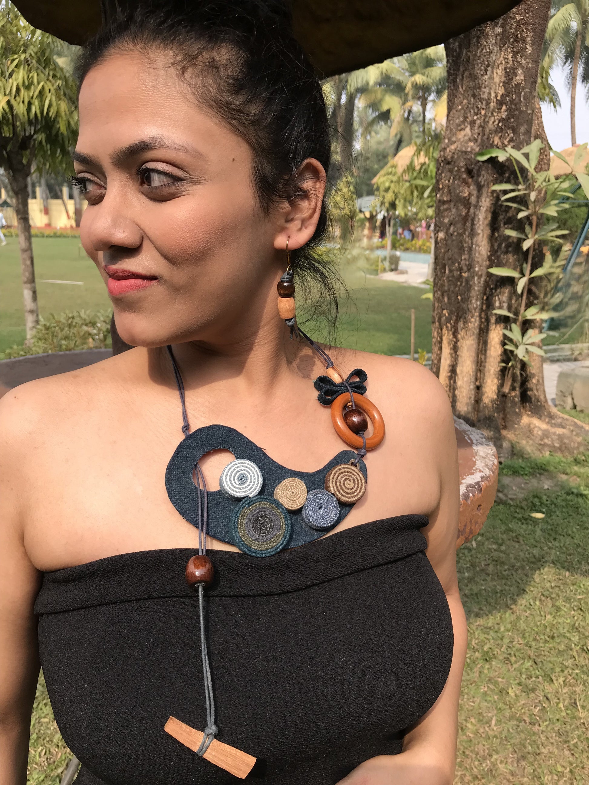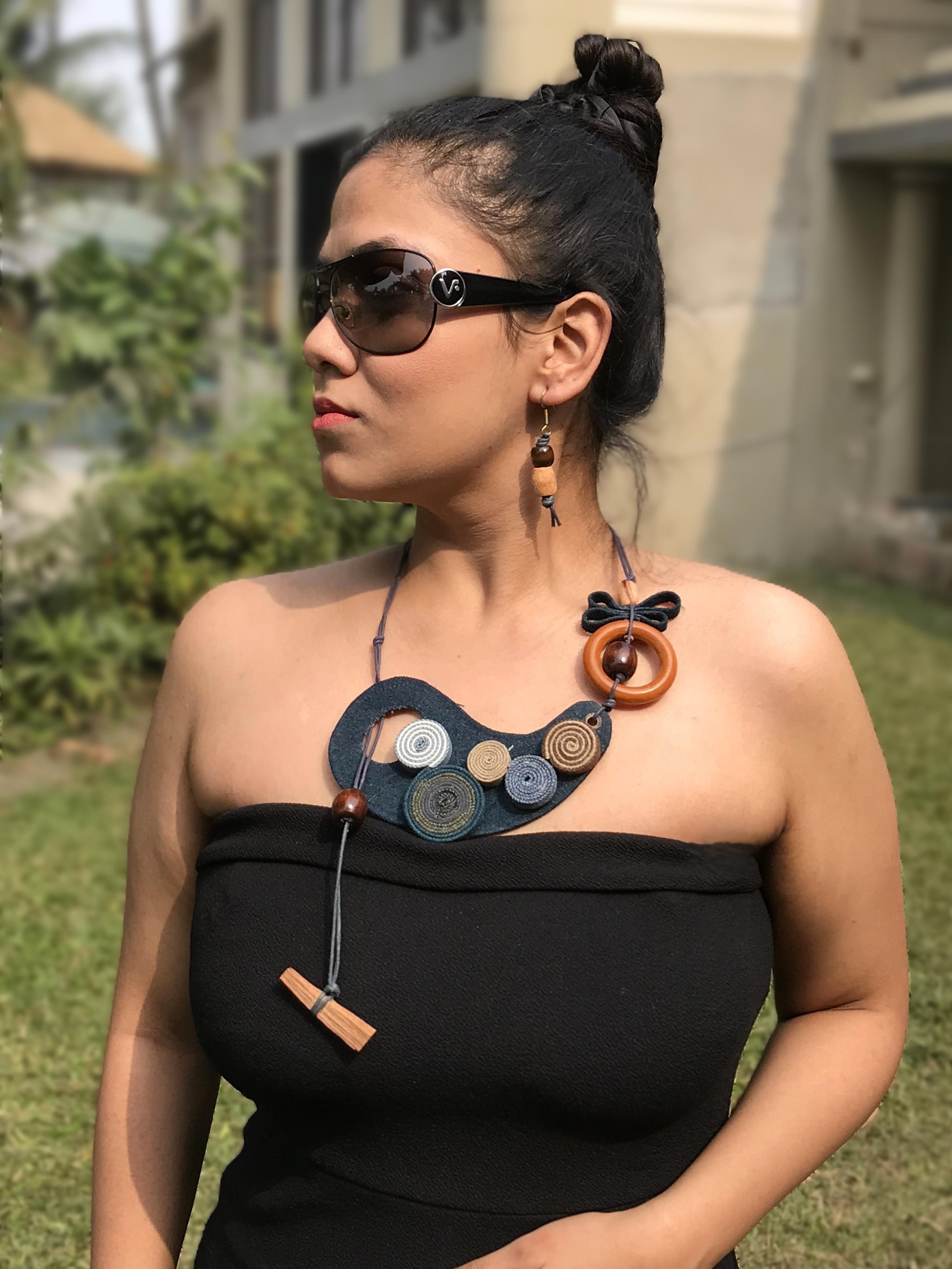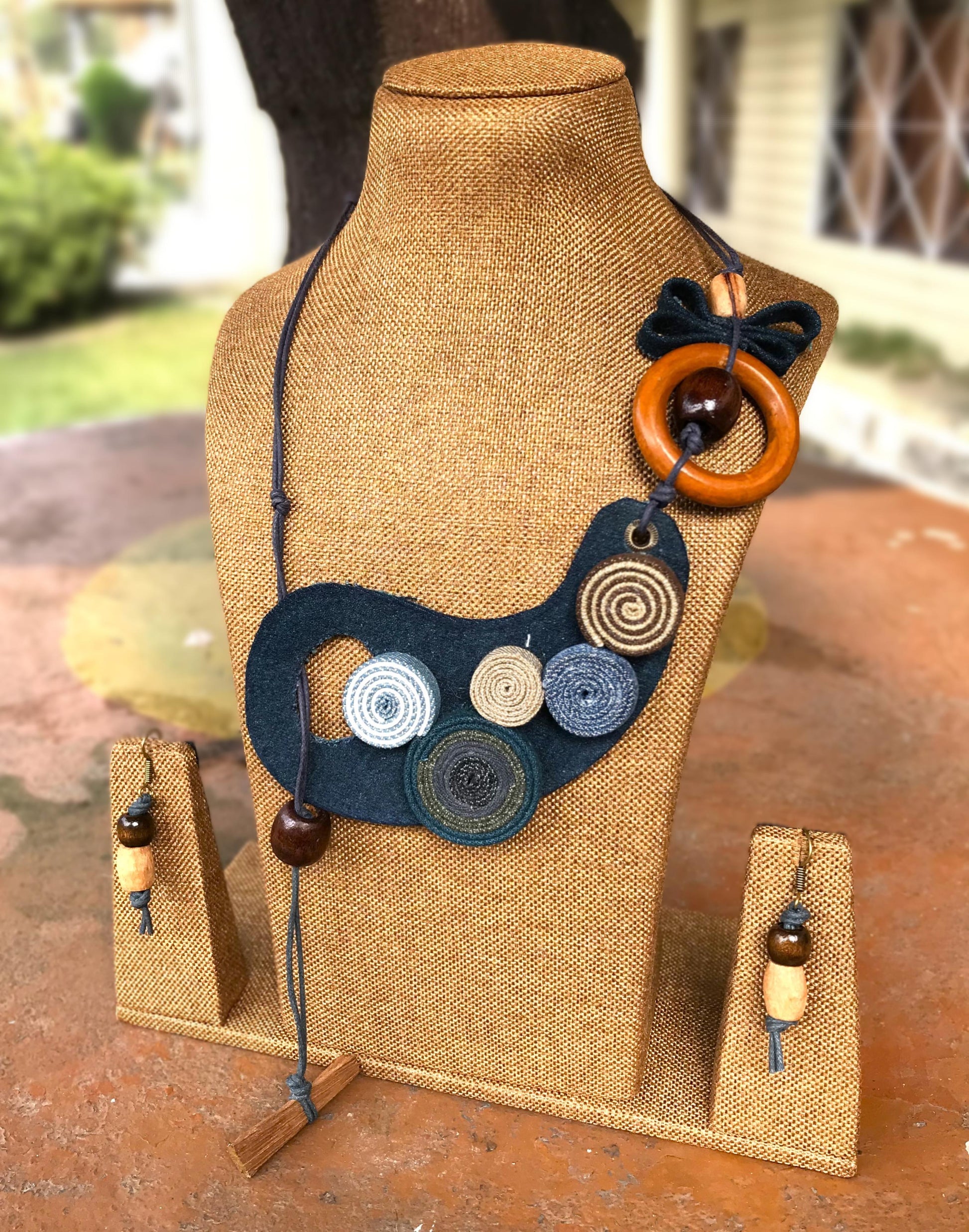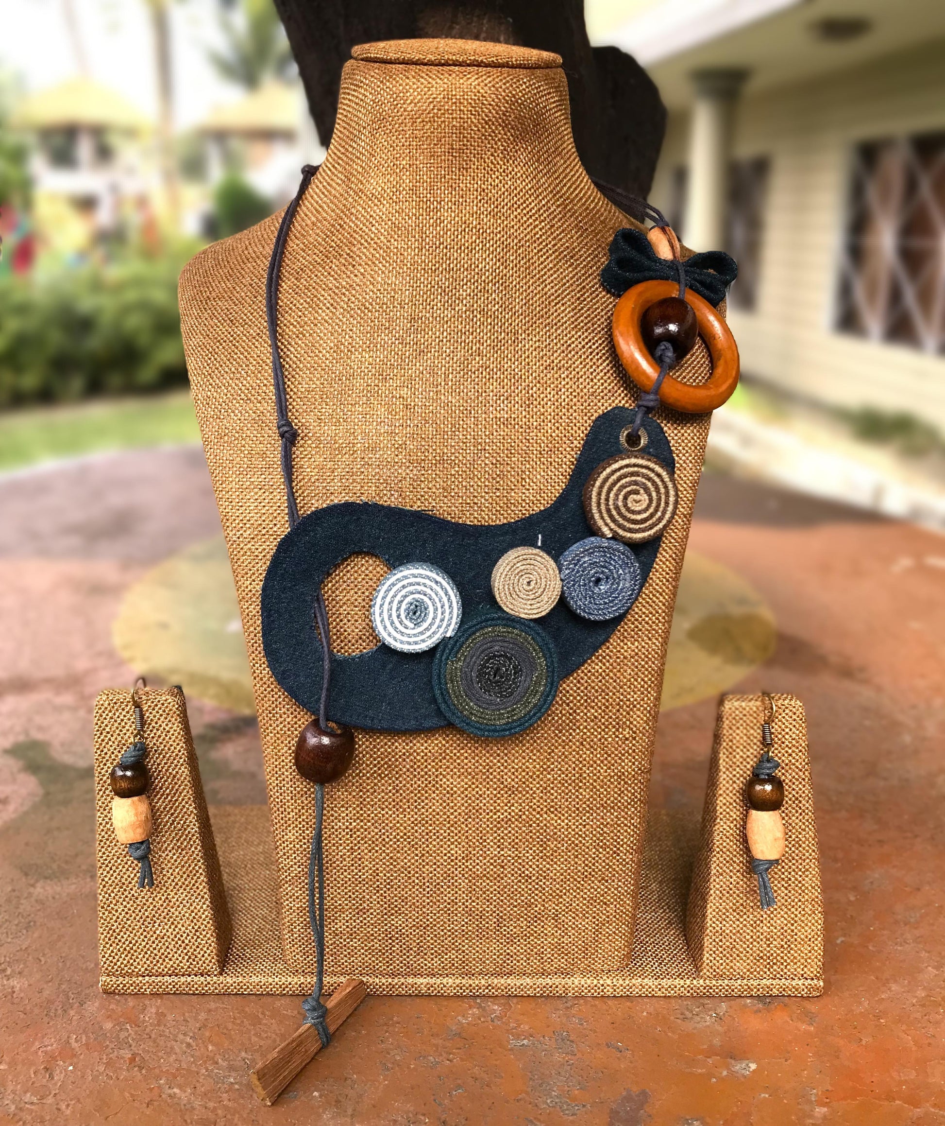 Denim jewellery is a unique and creative way to incorporate the durability and texture of denim fabric into fashion accessories. By combining denim with various embellishments such as leather, wooden beads & ceramic beads we have created stylish and often eco-friendly jewellery, each offering a casual yet chic aesthetic. The versatility of denim allows for both bold, statement pieces and subtle, minimalist designs. Denim’s rugged appeal contrasts beautifully with delicate accents, making these pieces stand out in a fashionable, everyday wardrobe.