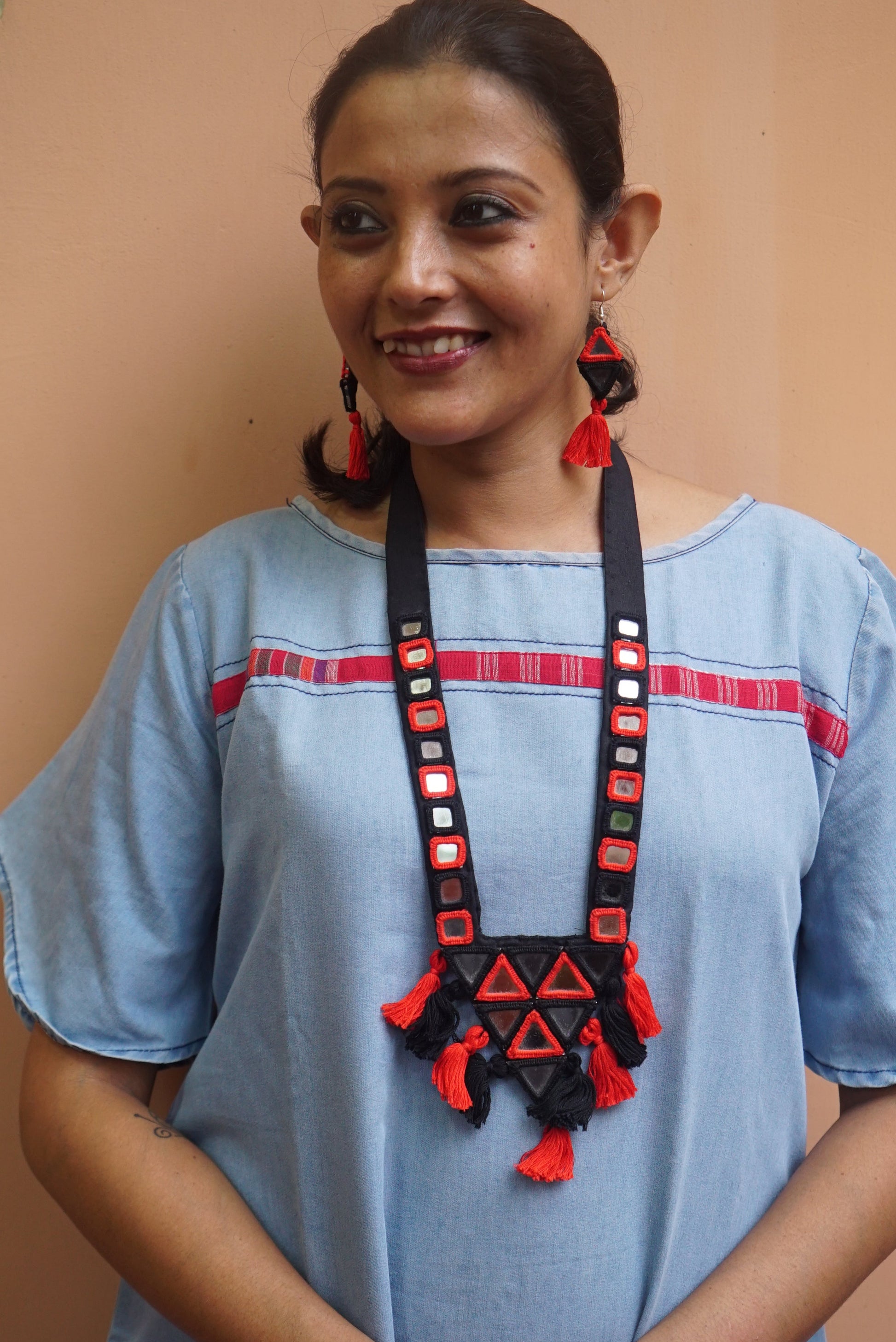 Mirror work jewellery is an exquisite form of handcrafted artistry that reflects both beauty and tradition. These exclusive ornaments often feature small, intricately cut mirrors embedded in a variety of jewellery pieces, from necklaces to earrings. Traditionally worn in Indian weddings and festivals, mirror jewellery has gained popularity globally for its bold, reflective designs that catch the light and create a dazzling effect. These handcrafted pieces are often paired with colourful beads and metalwork, creating a vibrant, festive look. Our Mirror jewellery ornaments are a perfect choice for those seeking to make a bold fashion statement with a touch of cultural heritage.