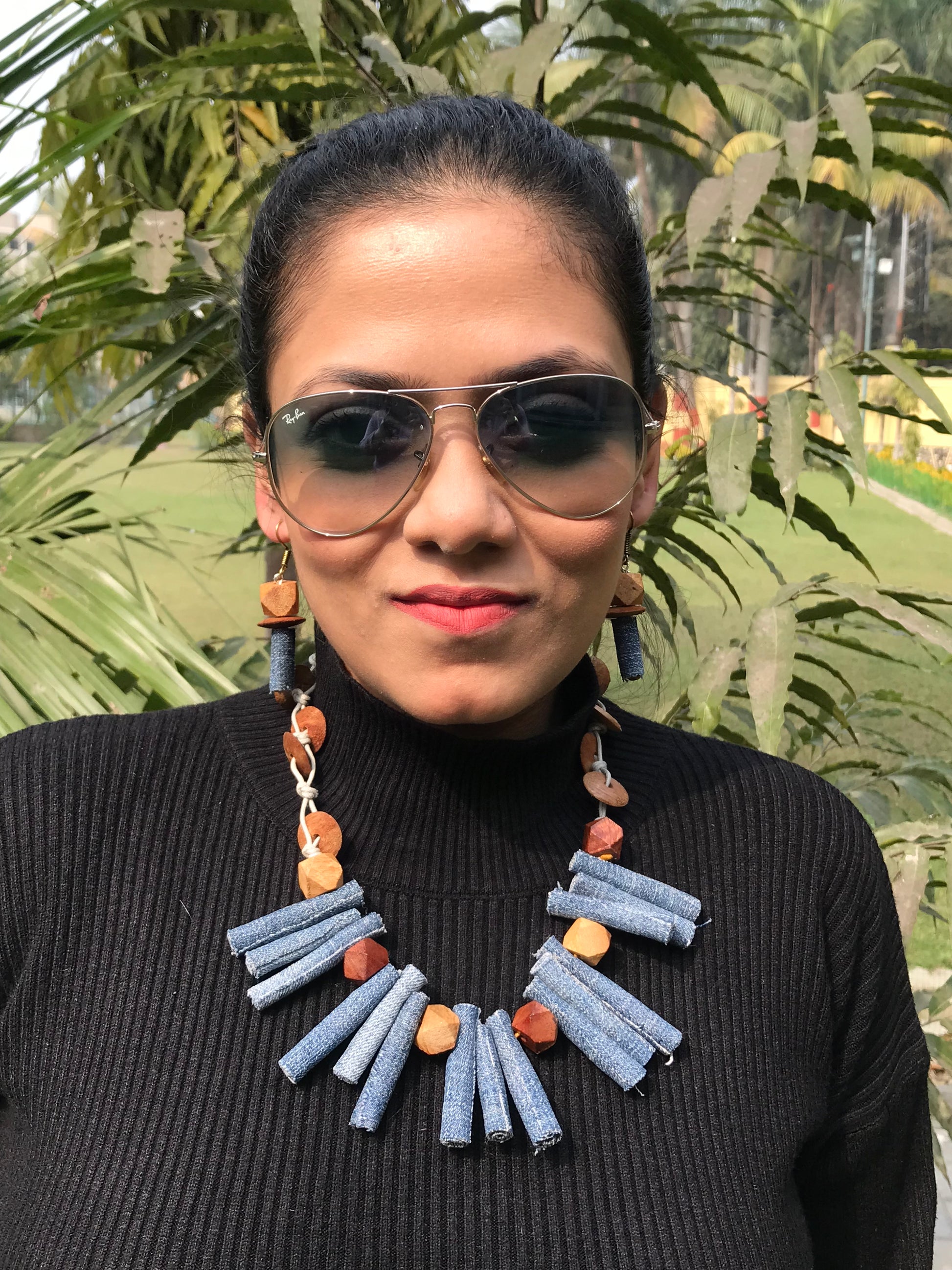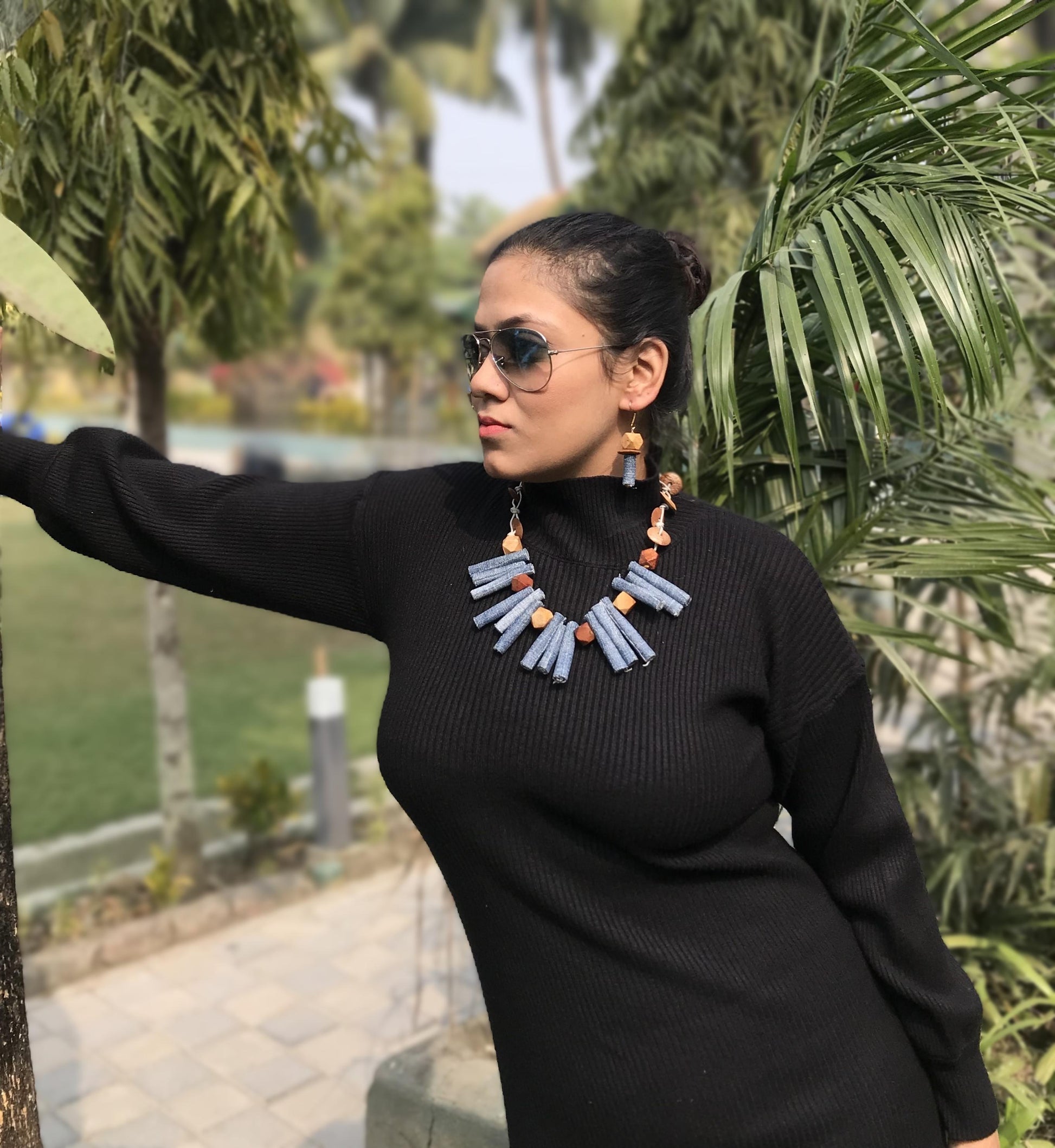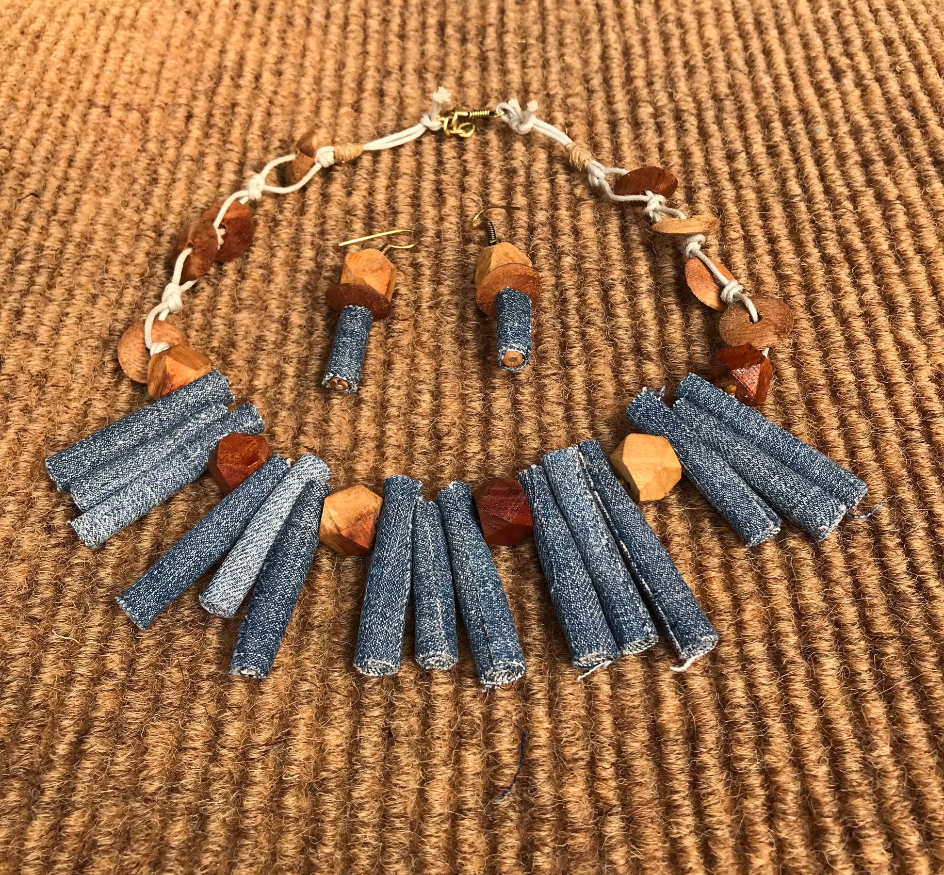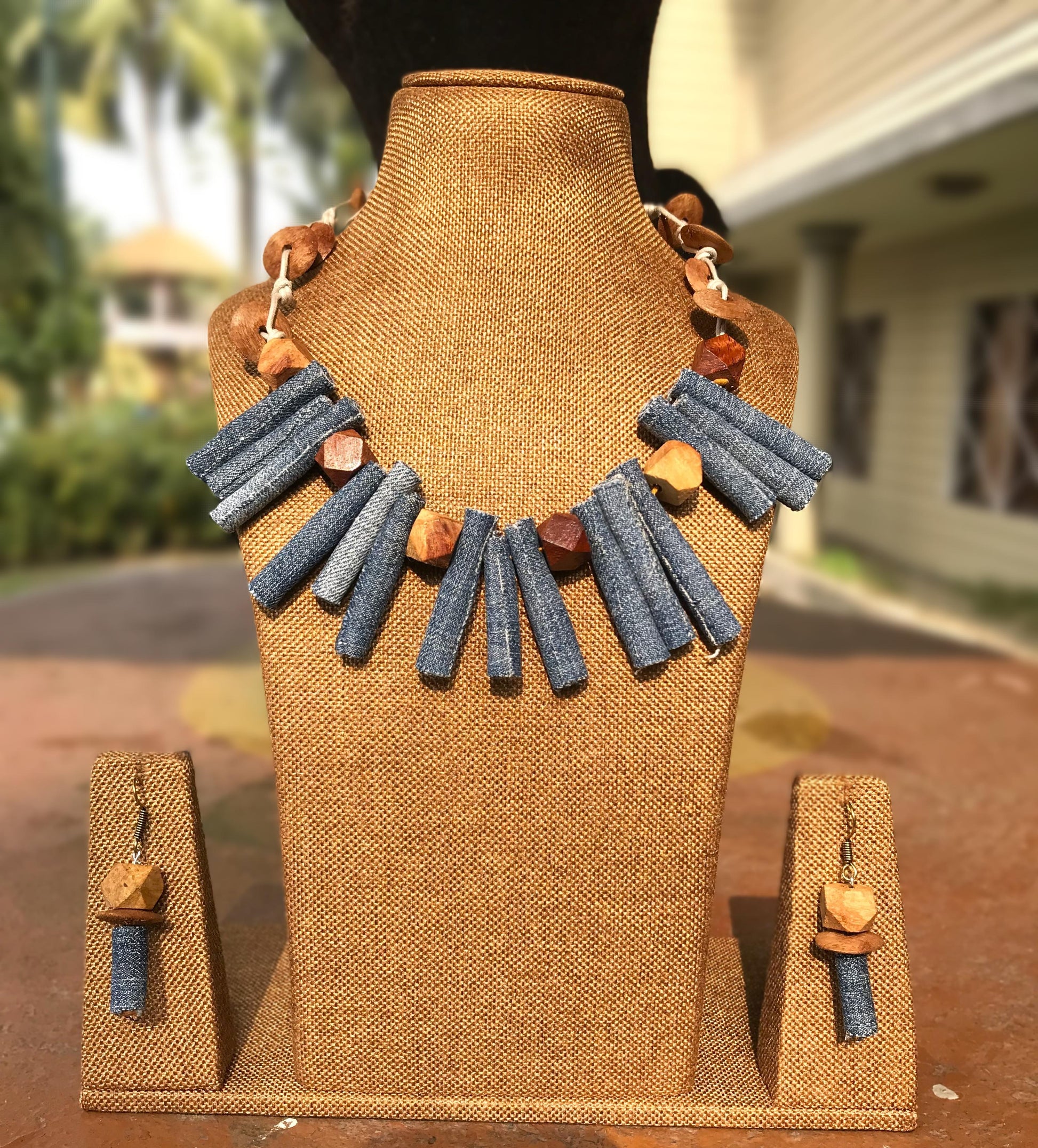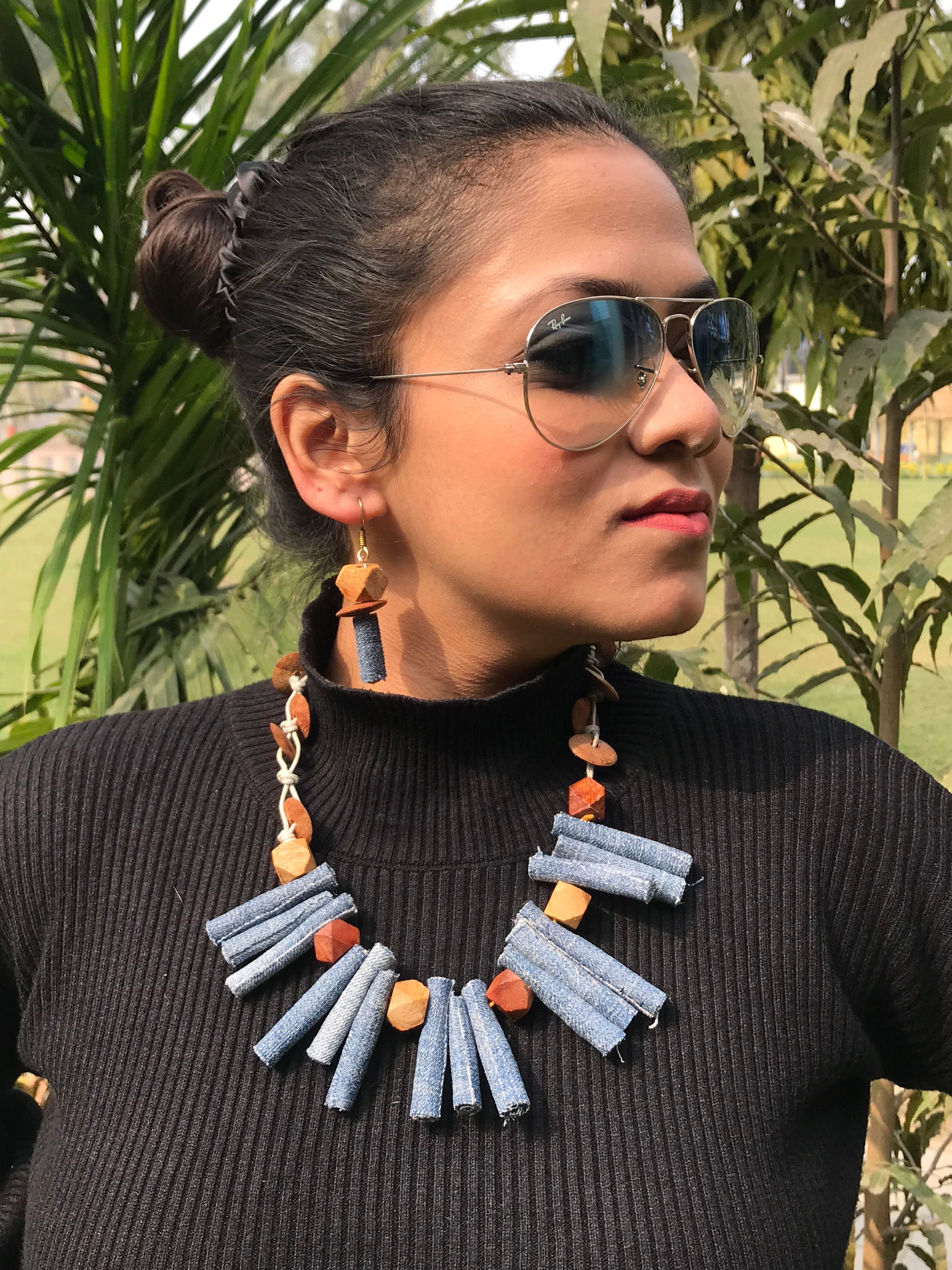 Denim jewellery is a unique and creative way to incorporate the durability and texture of denim fabric into fashion accessories. By combining denim with various embellishments such as leather, wooden beads & ceramic beads we have created stylish and often eco-friendly jewellery, each offering a casual yet chic aesthetic. The versatility of denim allows for both bold, statement pieces and subtle, minimalist designs. Denim’s rugged appeal contrasts beautifully with delicate accents, making these pieces stand out in a fashionable, everyday wardrobe.
