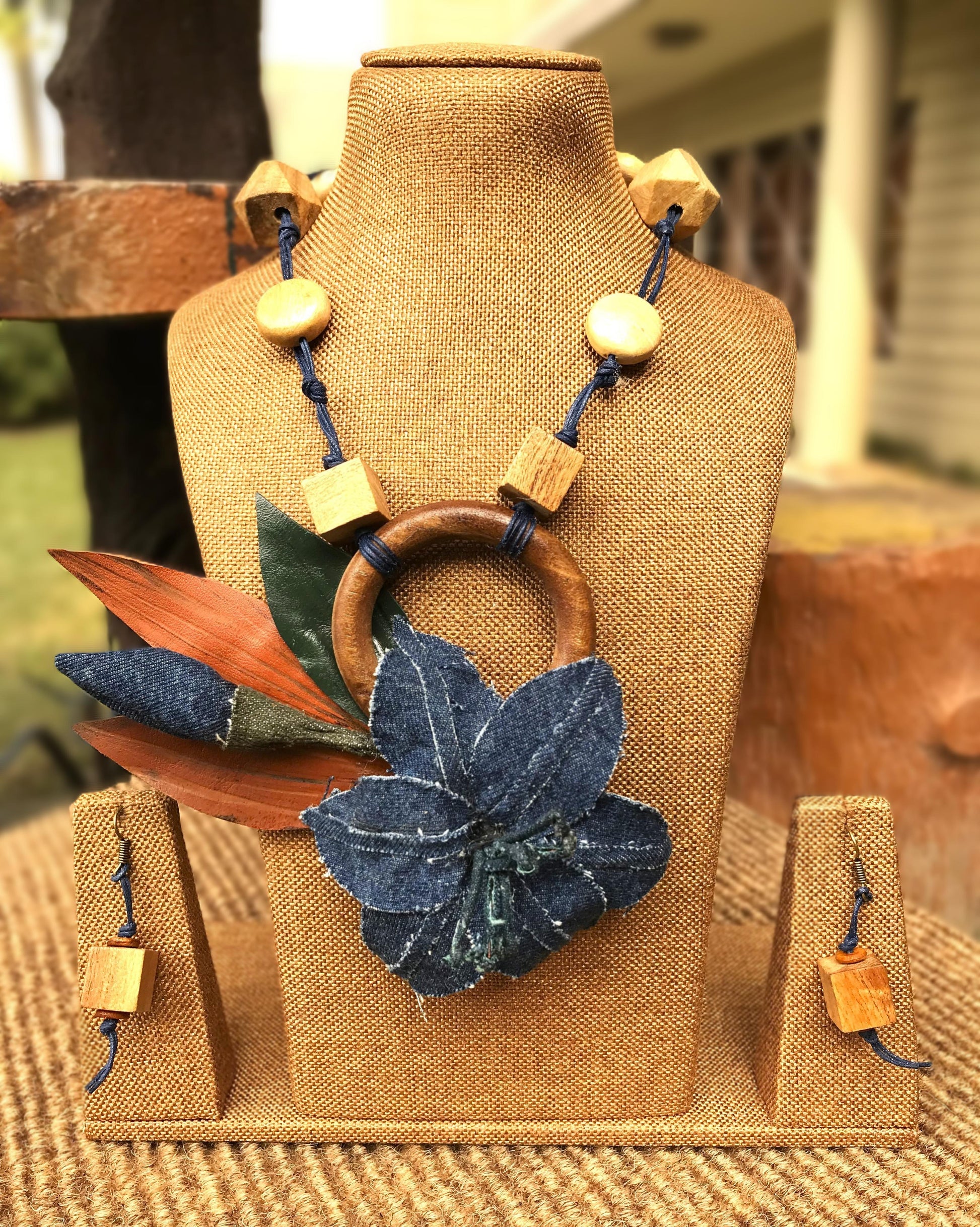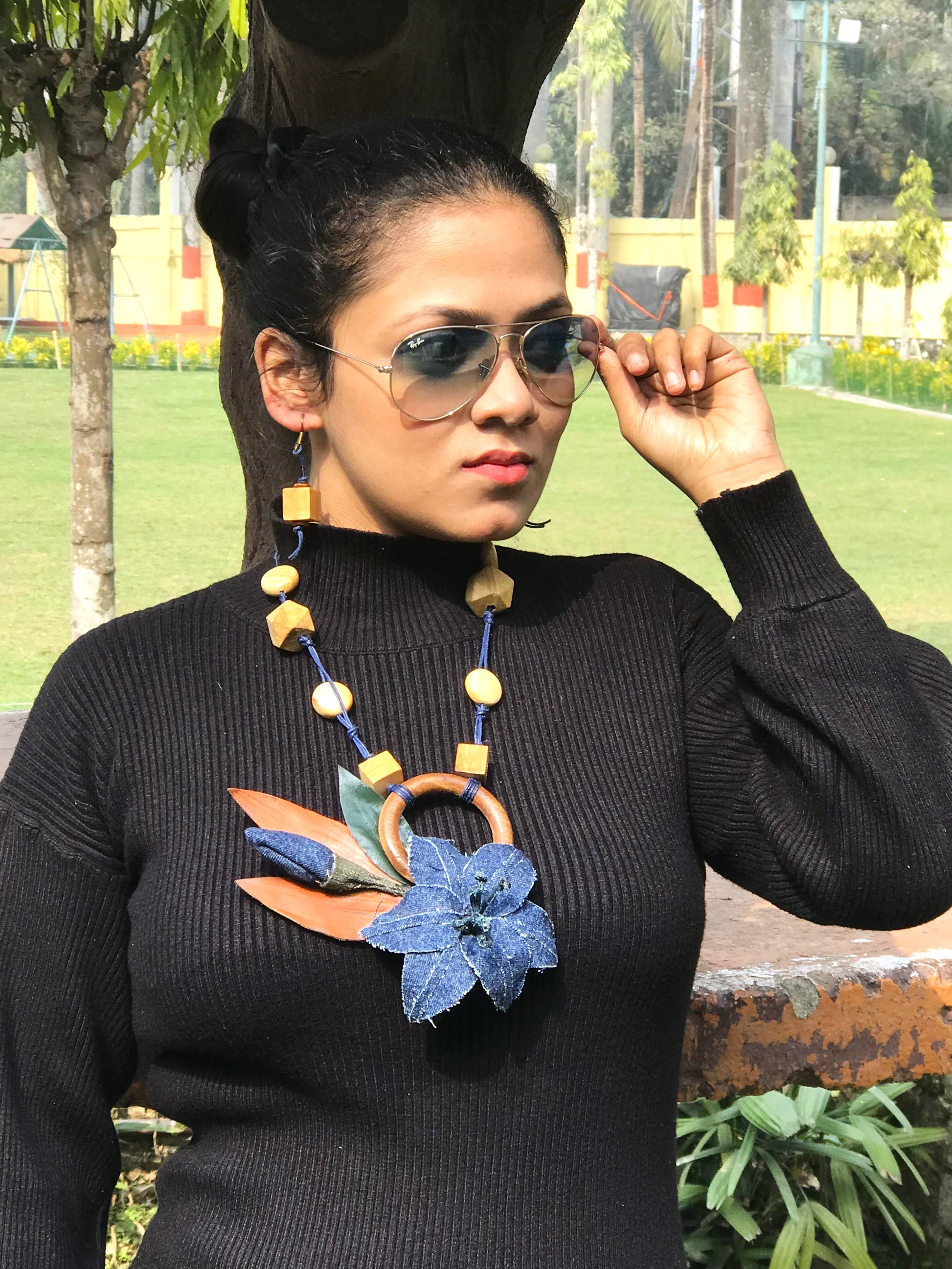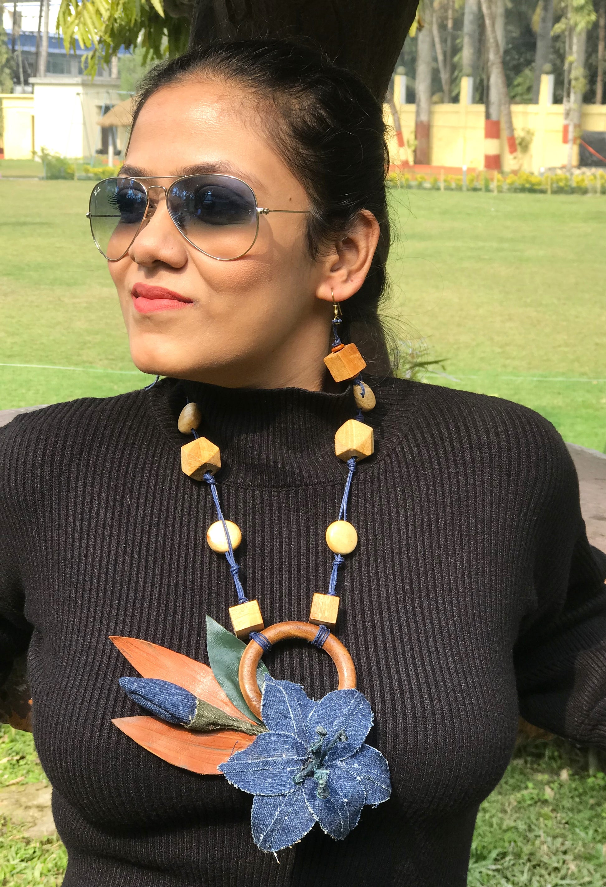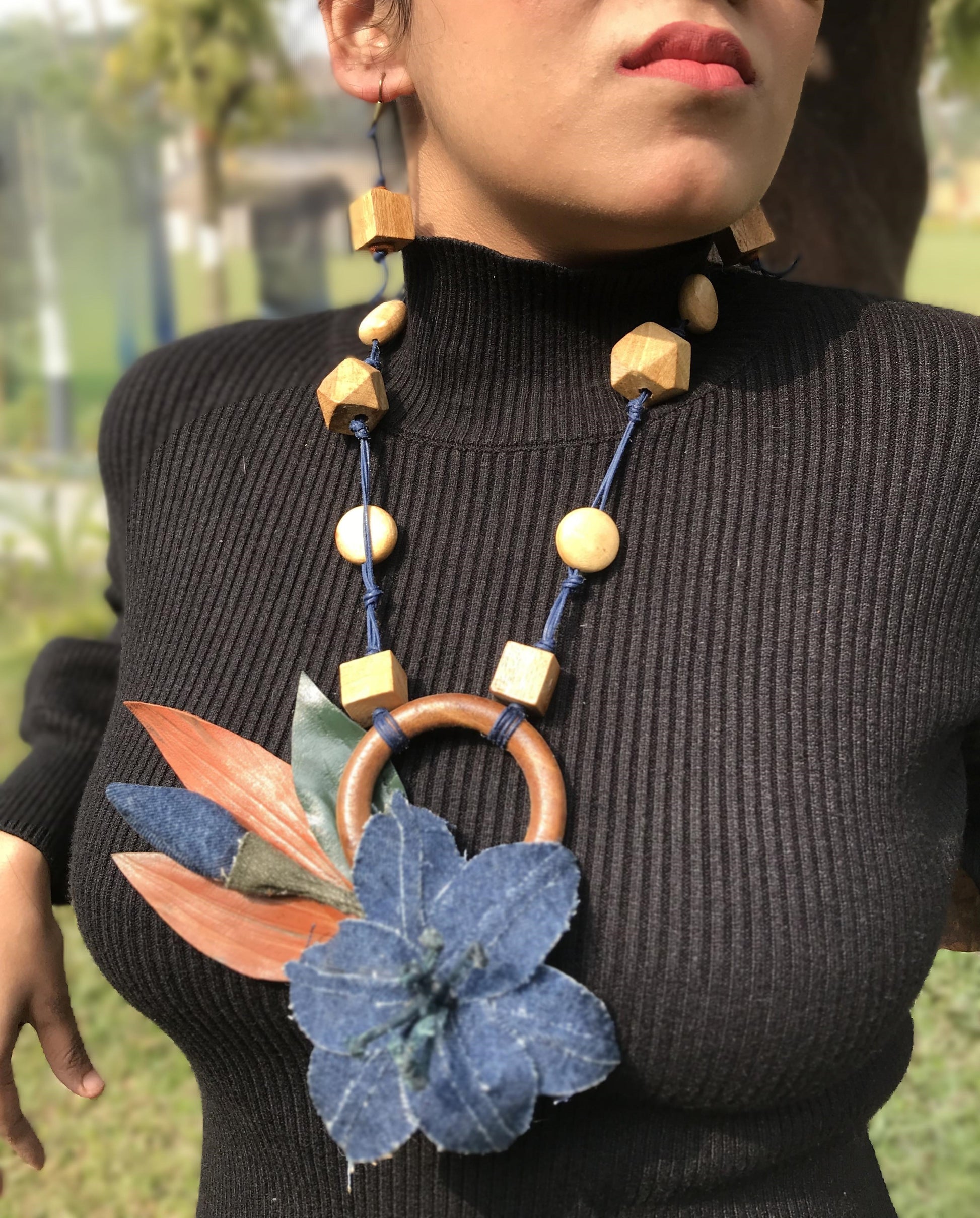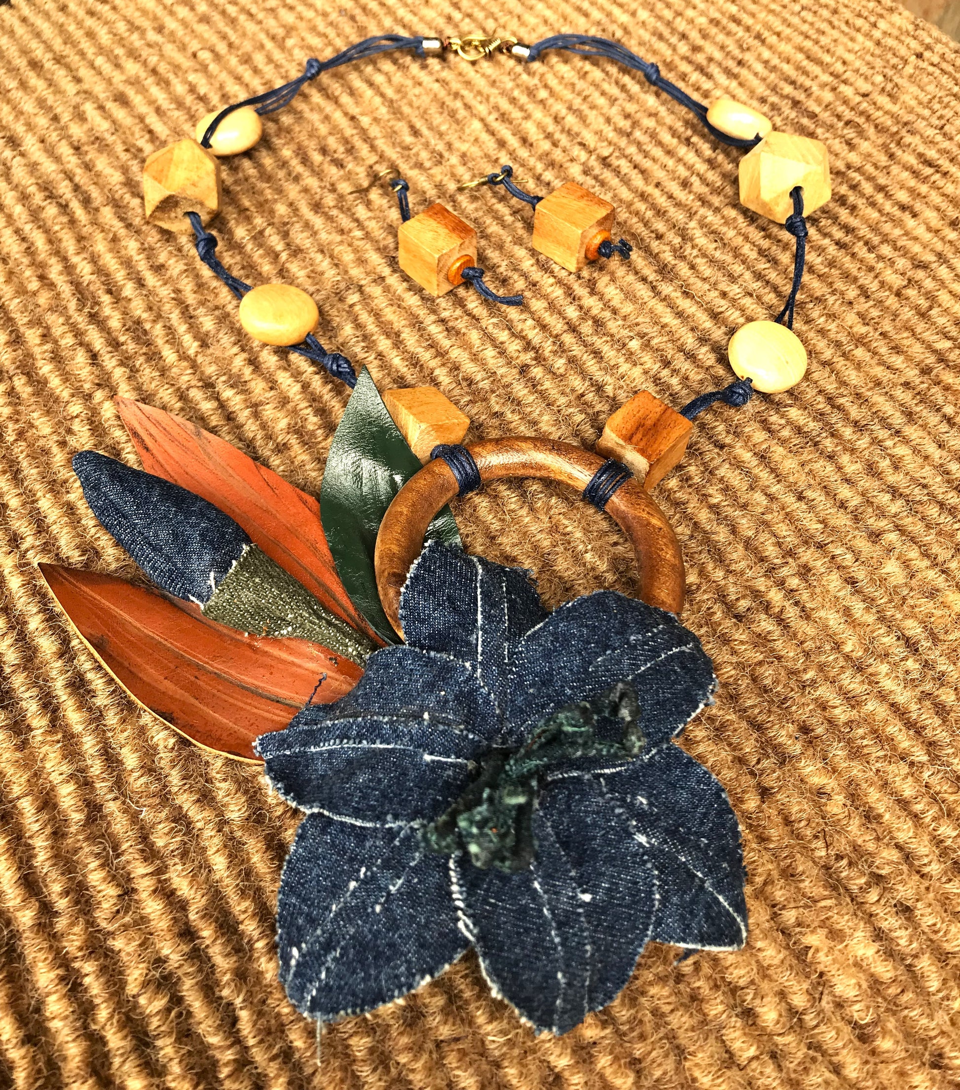 Denim jewellery is a unique and creative way to incorporate the durability and texture of denim fabric into fashion accessories. By combining denim with various embellishments such as leather, wooden beads & ceramic beads we have created stylish and often eco-friendly jewellery, each offering a casual yet chic aesthetic. The versatility of denim allows for both bold, statement pieces and subtle, minimalist designs. Denim’s rugged appeal contrasts beautifully with delicate accents, making these pieces stand out in a fashionable, everyday wardrobe.