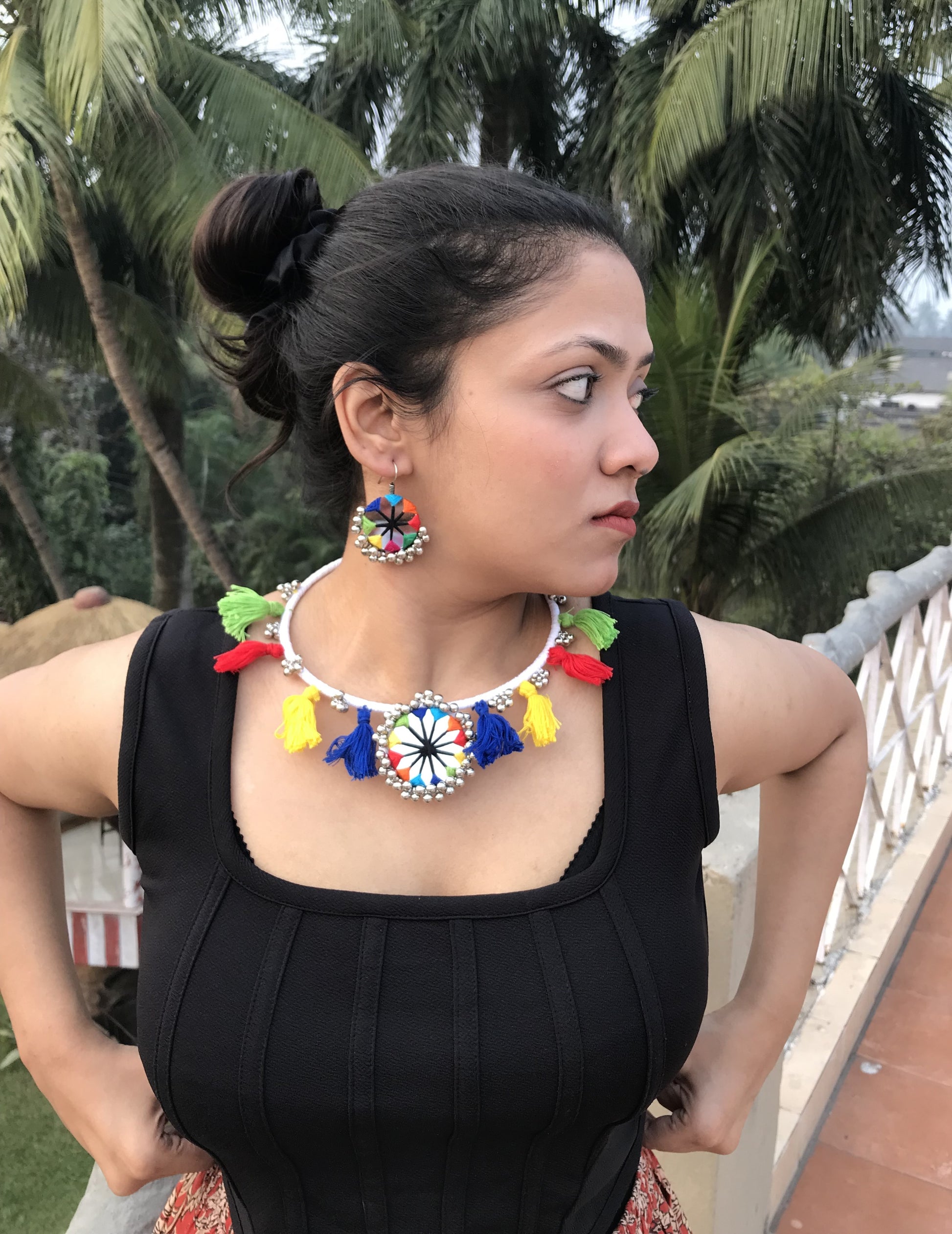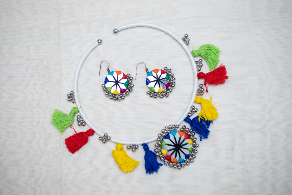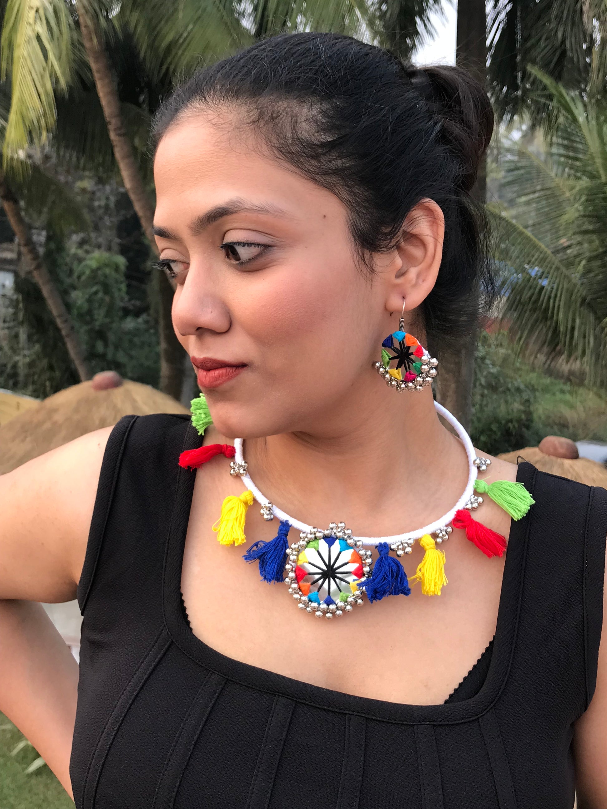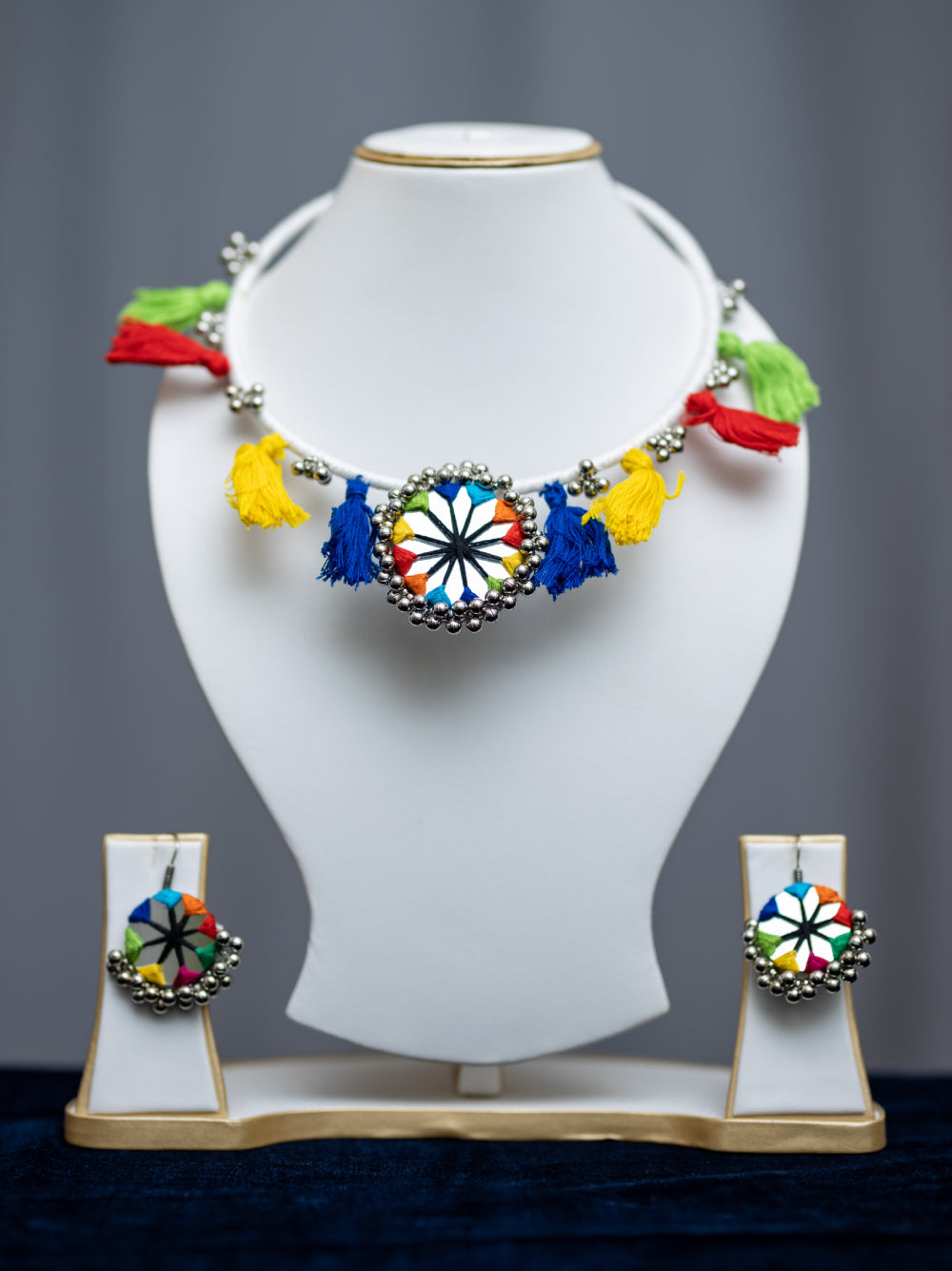 Mirror work jewellery is an exquisite form of handcrafted artistry that reflects both beauty and tradition. These exclusive ornaments often feature small, intricately cut mirrors embedded in a variety of jewellery pieces, from necklaces to earrings. Traditionally worn in Indian weddings and festivals, mirror jewellery has gained popularity globally for its bold, reflective designs that catch the light and create a dazzling effect. These handcrafted pieces are often paired with colourful beads and metalwork, creating a vibrant, festive look. Our handcrafted Mirror jewellery ornaments are a perfect choice for those seeking to make a bold fashion statement with a touch of cultural heritage.