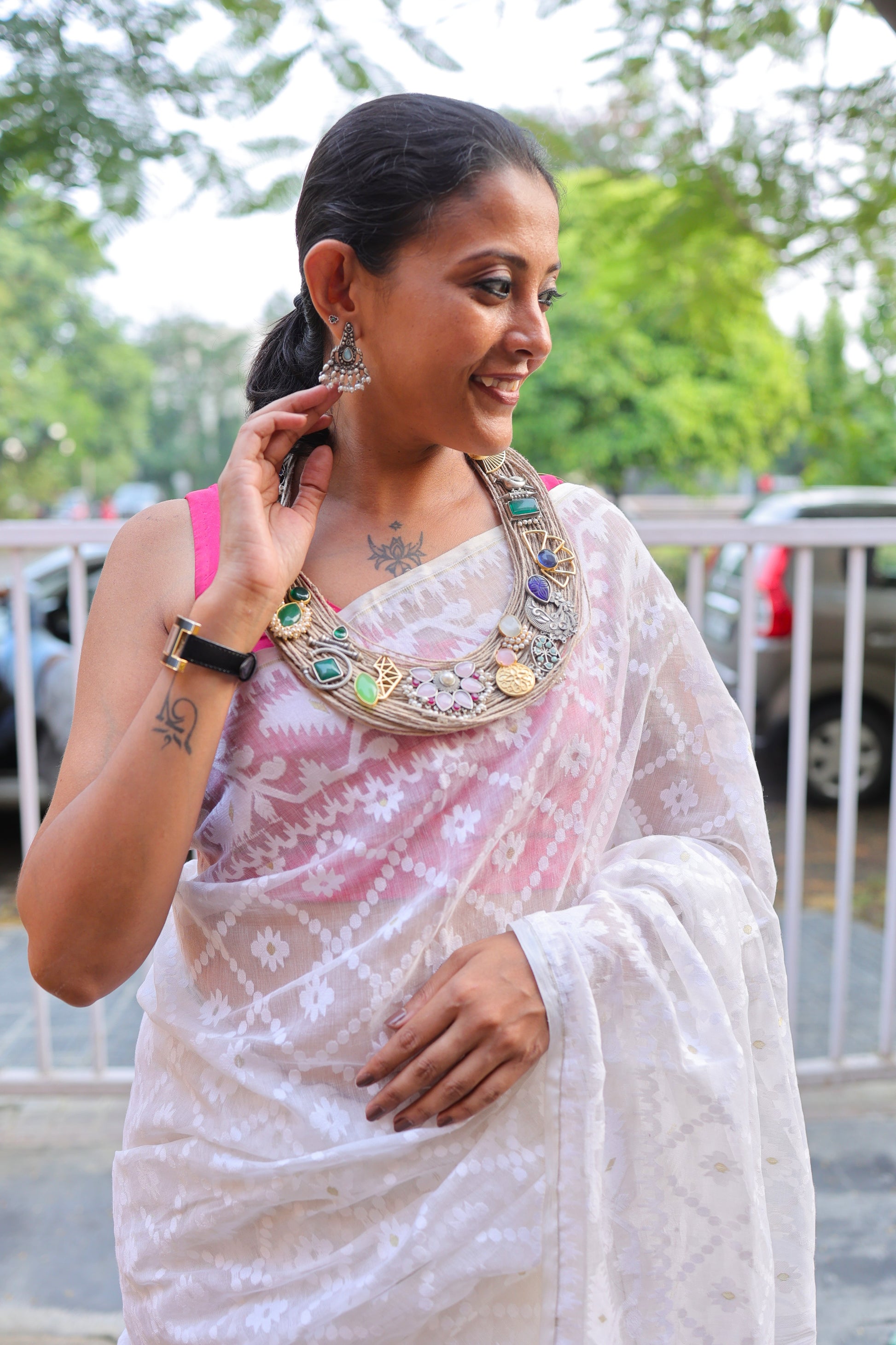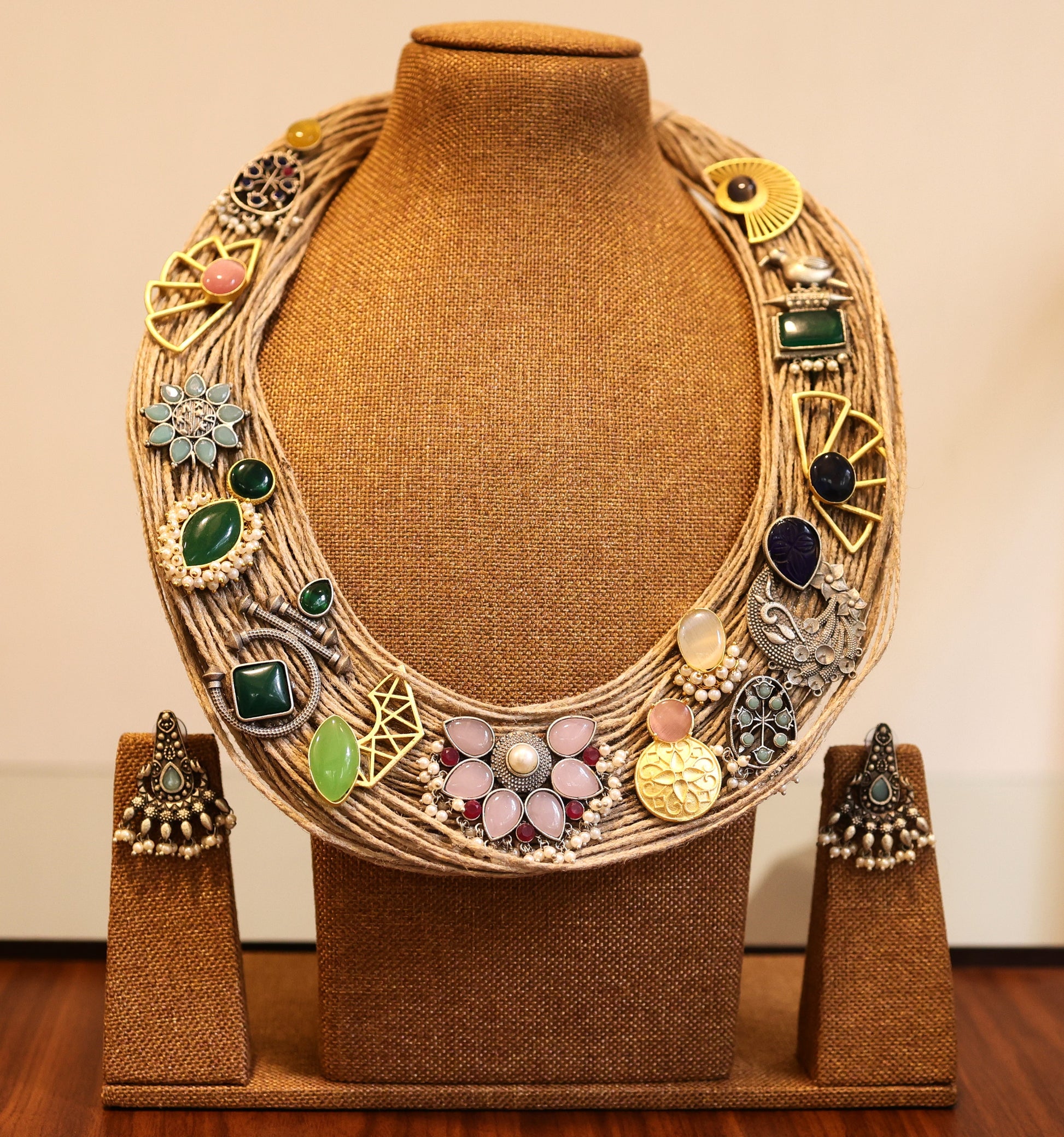 Jute jewellery has gained popularity for its eco-friendly nature and exclusive designs. These exquisite pieces are meticulously handcrafted from natural fibres, offering a sustainable yet fashionable alternative to traditional jewellery. Jute ornaments often feature intricate weaving techniques and can be embellished with beads, kori, stones, or fabric for added flair. Ideal for casual or boho-chic looks, our ornamental jute jewellery effortlessly complements earthy tones and natural fabrics. These unique accessories are perfect for environmentally conscious individuals who appreciate the beauty of handcrafted, sustainable designs.